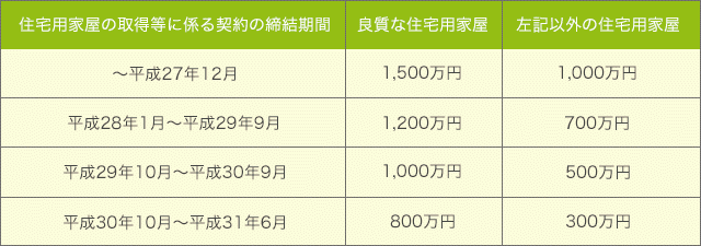 平成 27年1月1日から平成 33年 12 月 31日までの間に、父母 や祖父母 など直系尊属 から の贈 与により、 自己の居住用に供する住宅用の家屋の新築 、取得又は増改築等の対価に充てるための金銭を取得した場合にお いて、 一定の要件を満たすときは、次の限度額までの金額について贈与税 が非課税となる制度。