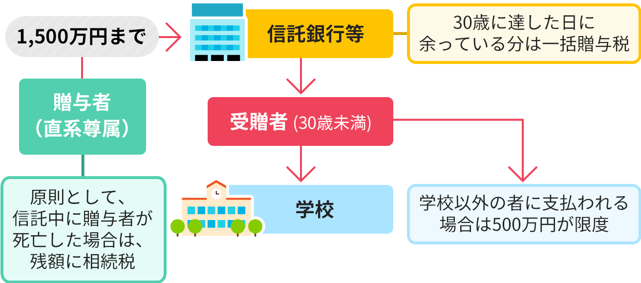 受贈者(30歳未満限定)の教育資金に充てるために、その父母や祖父母などの直系尊属が金銭等を拠出して金融機関に信託等をした場合には、金融機関等の営業所等を経由して教育資金非課税申告書を提出することにより、その信託受益権等の価額のうち受贈者1人につき1,500万円までの金額に相当する部分の価額について、贈与税を非課税とする制度です。