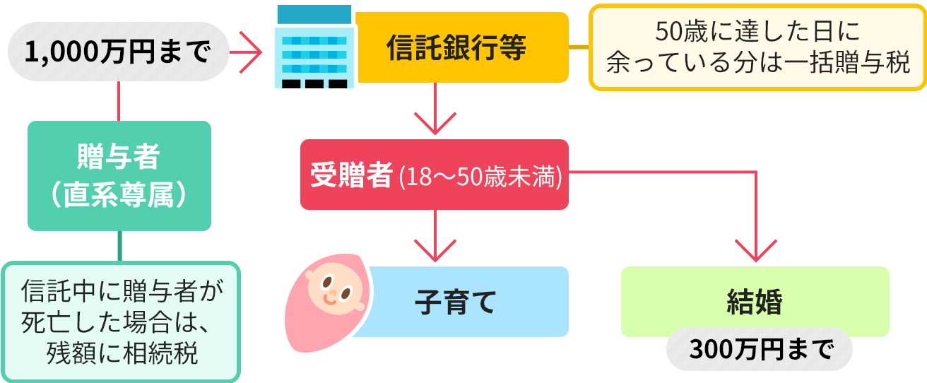18歳以上50歳未満の受贈者の結婚・子育て資金に充てるために、その父母や祖父母などの直系尊属が金銭等を拠出して金融機関に信託等をした場合には、金融機関等の営業所等を経由して結婚・子育て資金非課税申告書を提出することにより、その信託受益権等の価額のうち受贈者1人につき1,000万円までの金額に相当する部分の価額について、贈与税を非課税とする制度です。結婚・子育て資金とは、①結婚に際して支払われる金銭(挙式費用、衣装代等の婚礼費用、新居への転居費用など)、②妊娠、出産、育児のために支払われる金銭(不妊治療費、妊婦健診代、分娩費、就学前の子の医療費、幼稚園等の保育料など)を指し、①については300万円が非課税限度額となります。